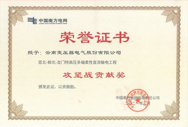 中国南方电网-昆柳龙直流工程-攻坚战贡献奖-荣誉证书